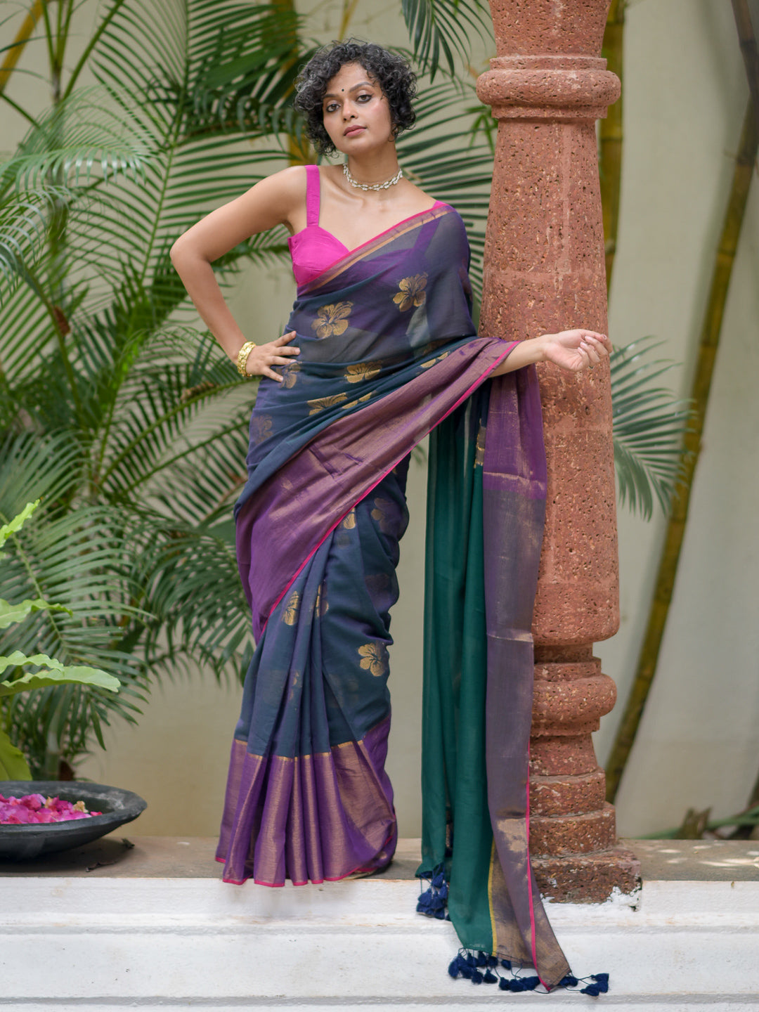 Deep Blue Cotton Blend Saree with Golden Hibiscus Motifs & Dark Green Pallu & Purple-Gold Border