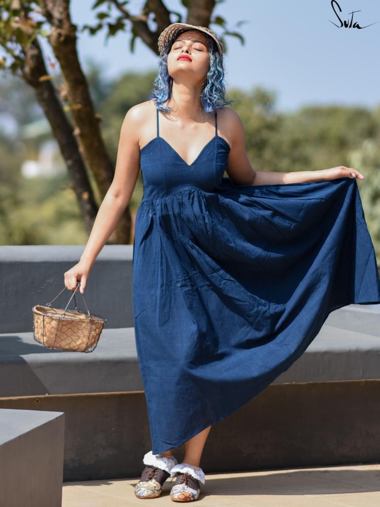 This Indigo coloured spaghetti sleeved underlay dress with high-low hemline is just what you need in your wardrobe! The handloom cotton, naturally-dyed fabric steals the heart. The convenient pockets have your back!