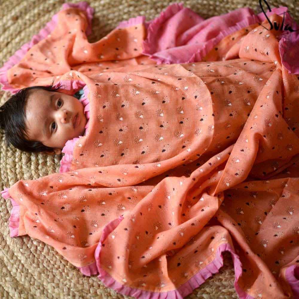 Willy-woolly mammoth was the baby’s favourite to play with, it was less toy and more of a friend, in fact! You see, that was the little one’s secret power. With a silly little giggle, every perceivable element around became a friend for life like that was the most natural course of action! This pink and orange screen printed swaddle in the softest made-in-heaven mul is the perfect hug for the little munchkin to chill in!