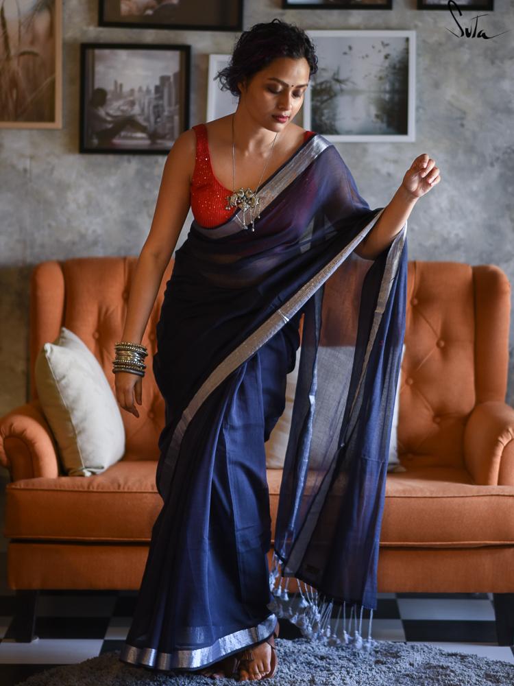 Navy Blue Cotton Silver Zari Border Saree with Tassels