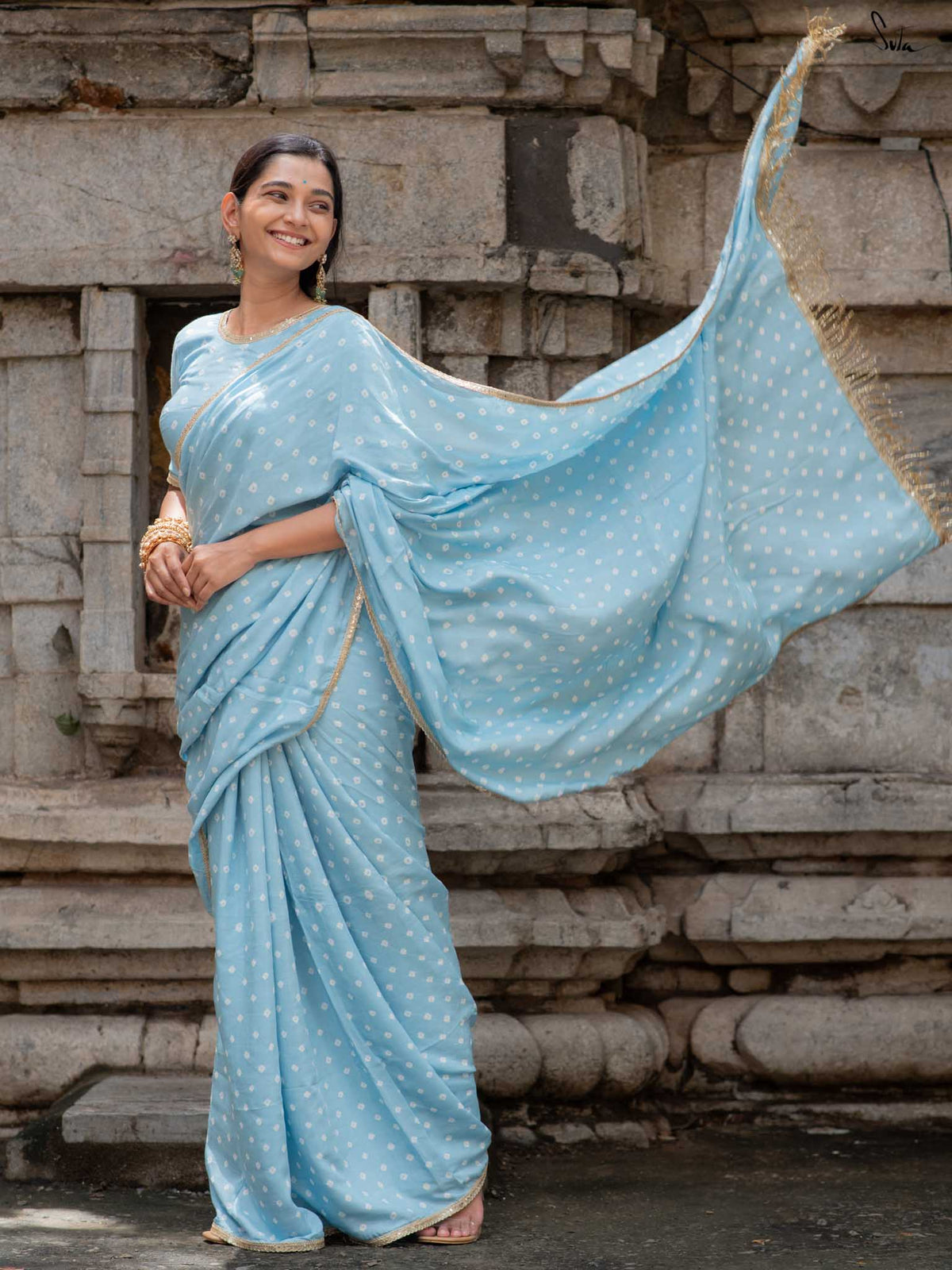 Neela sa Bandhej is a serene yet striking drape from the Rangrez collection, blending the depth of teal with the calm of sky blue in a delicate ombré flow. Woven in lightweight cotton muslin, the saree is brought to life through the traditional tie-and-dye Bandhani technique of Gujarat, where dotted patterns whisper stories of heritage. The cool tones are brightened with a festive touch of gold lace and handcrafted beaded tassels, making the saree shimmer with understated elegance. Effortless to carry and graceful in movement, Neela sa Bandhej feels like a breath of fresh air—perfect for festive evenings under open skies.
