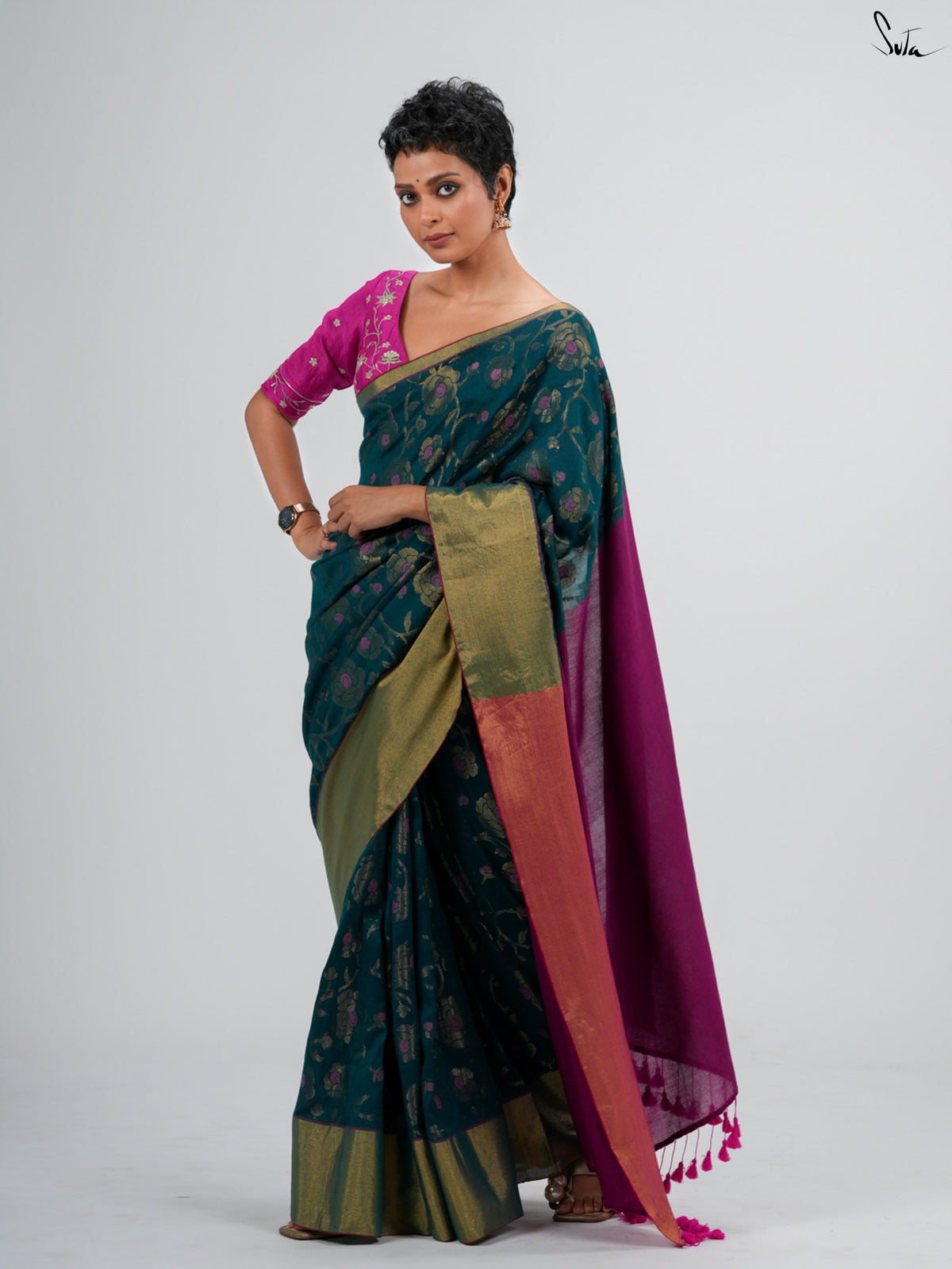 Green Cotton Acrylic Saree with Floral Print and Zari Border