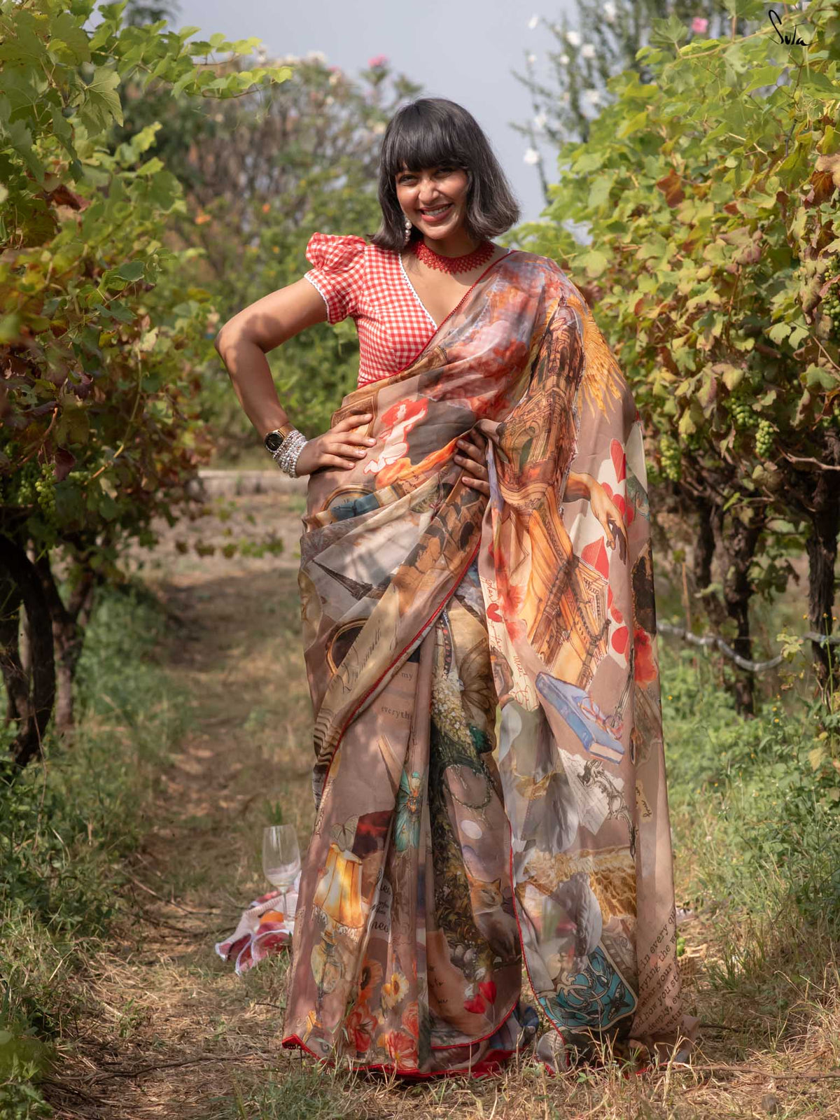In the realm of love, it’s the quiet gestures that echo the loudest, the gentle caress, a whispered vow, a love letter written with soul. Once Upon A Time is a saree that celebrates these cherished moments of self-love. Crafted from viscose organza, this multicolored masterpiece weaves together the magic of romance and nostalgia. Cut-out collages and a heartfelt love letter delicately adorn the pallu. This saree comes with a red-and-white checkered blouse piece attached.