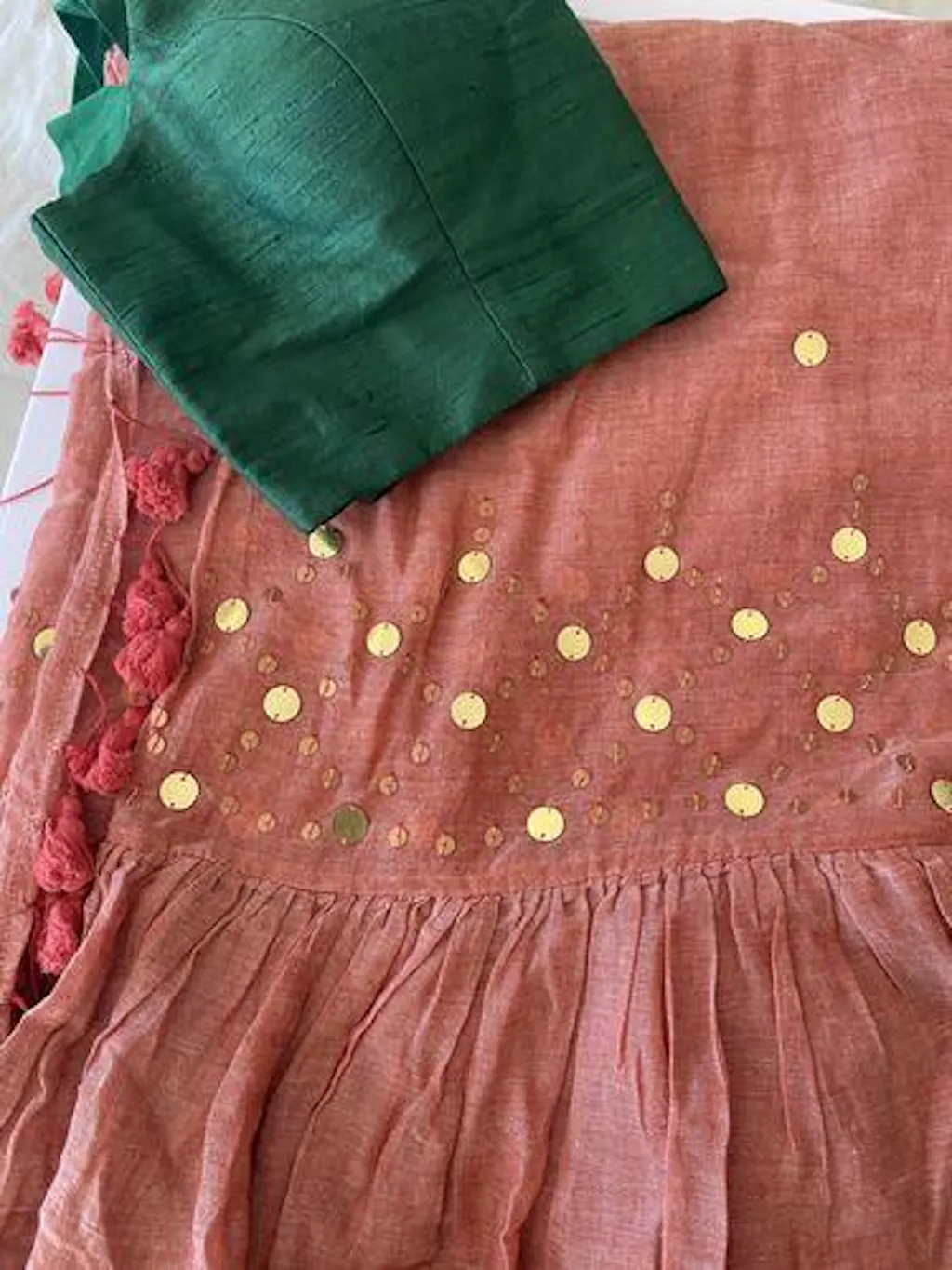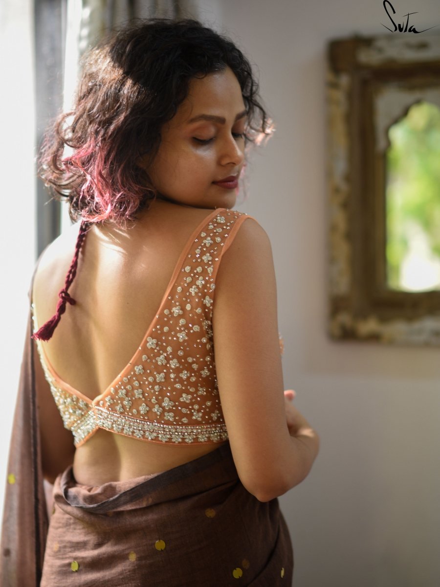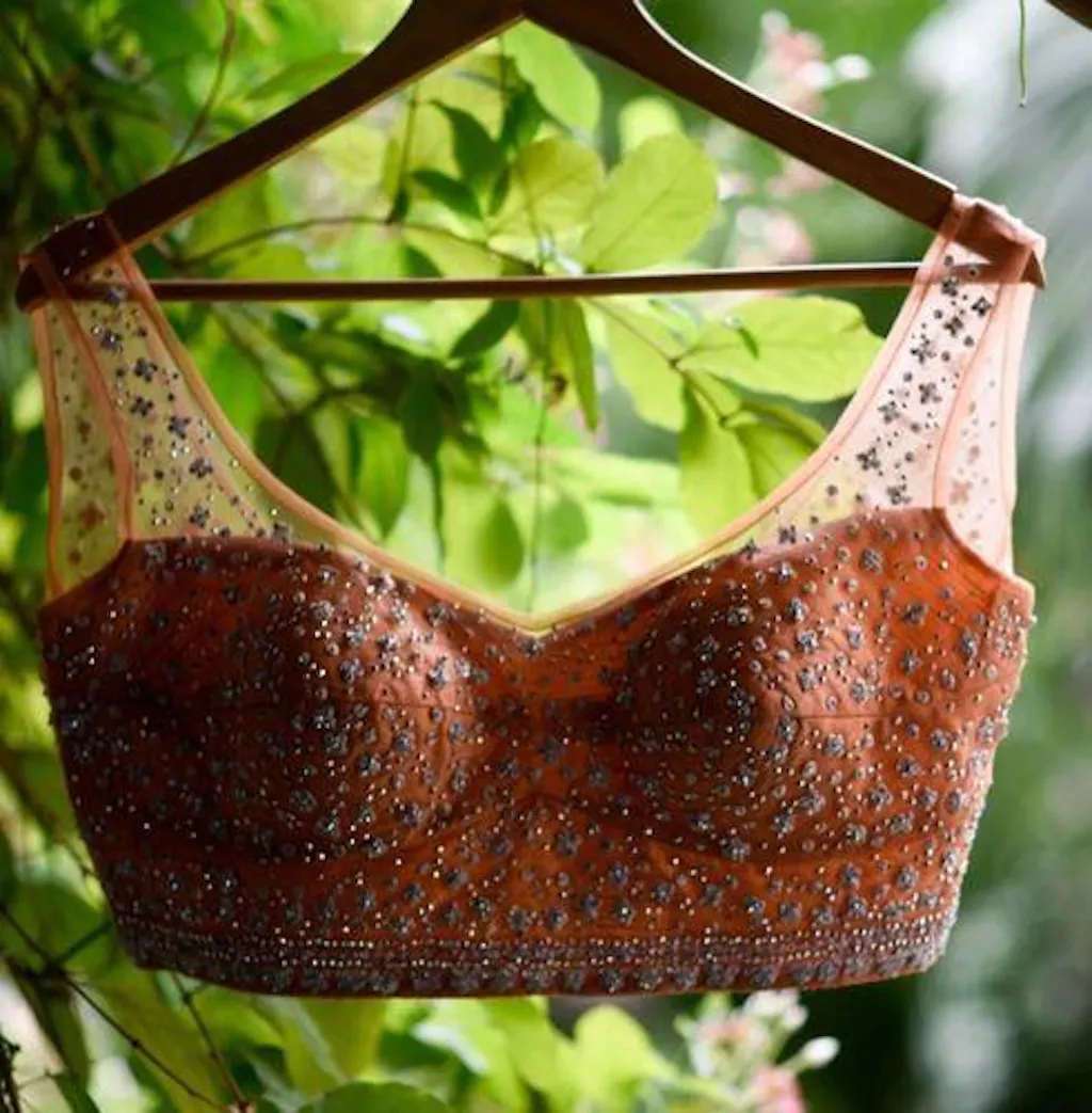 Polyester is a synthetically manufactured fabric that is known for its durability and a characteristic texture. The making of this blouse from fabric is an extensive process where our karigars and tailors come together. First, the master tailor makes a pattern on a brown paper for each size. Our karigars then trace this pattern onto the netted fabric of the blouse. This is then secured to a wooden frame for the hand embroidery to be done. Once this is done, the glitter is pasted onto the design and left to dry. When the fabric is finally ready, it goes to the tailors for the final cutting and sewing. And then behold! the magic of the blouse comes alive!