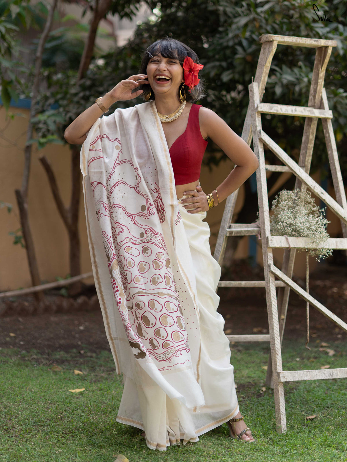 White Chanderi Silk Hand Painted Designer Saree with Golden Border