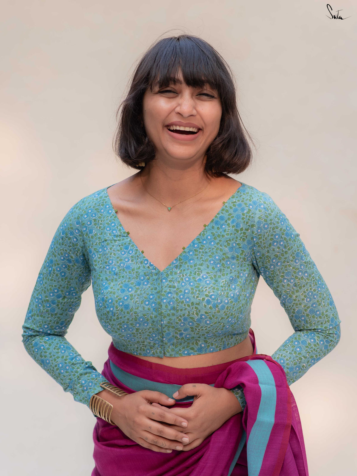 Comfort that shows up, coverage that still feels light - Phool Coverage is designed for long days and easy confidence. Made in breathable cotton, this blue blouse features all-over block printing, a flattering V-neck, and full sleeves that add structure without weighing you down.