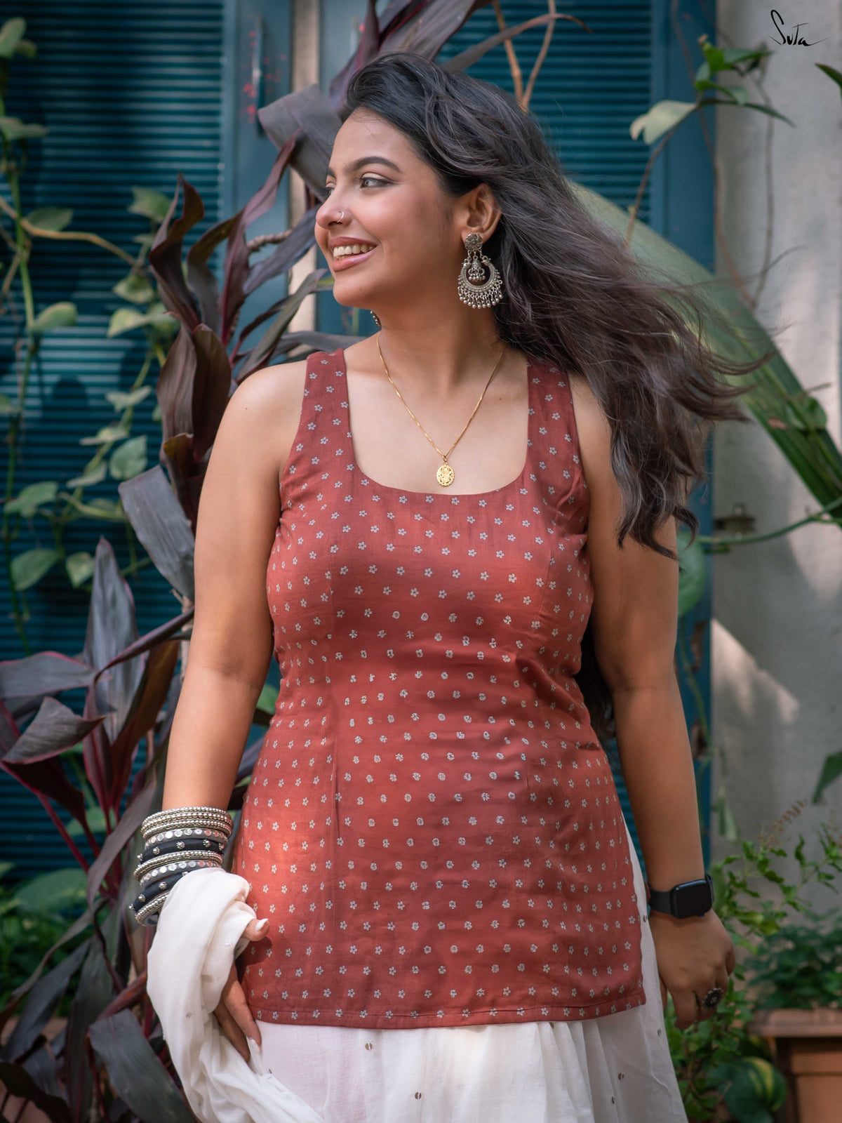 Brown Printed Cotton Sleeveless Kurta Blouse with Deep Back