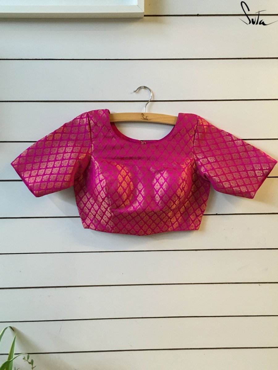 Polyester is a synthetically manufactured fabric that is known for its durability and a characteristic texture. The making of this blouse from fabric is an extensive process where our karigars and tailors come together. First, the master tailor makes a pattern on a brown paper for each size. Our karigars then trace this pattern onto the netted fabric of the blouse. This is then secured to a wooden frame for the hand embroidery to be done. Once this is done, the glitter is pasted onto the design and left to dry. When the fabric is finally ready, it goes to the tailors for the final cutting and sewing. And then behold! the magic of the blouse comes alive!