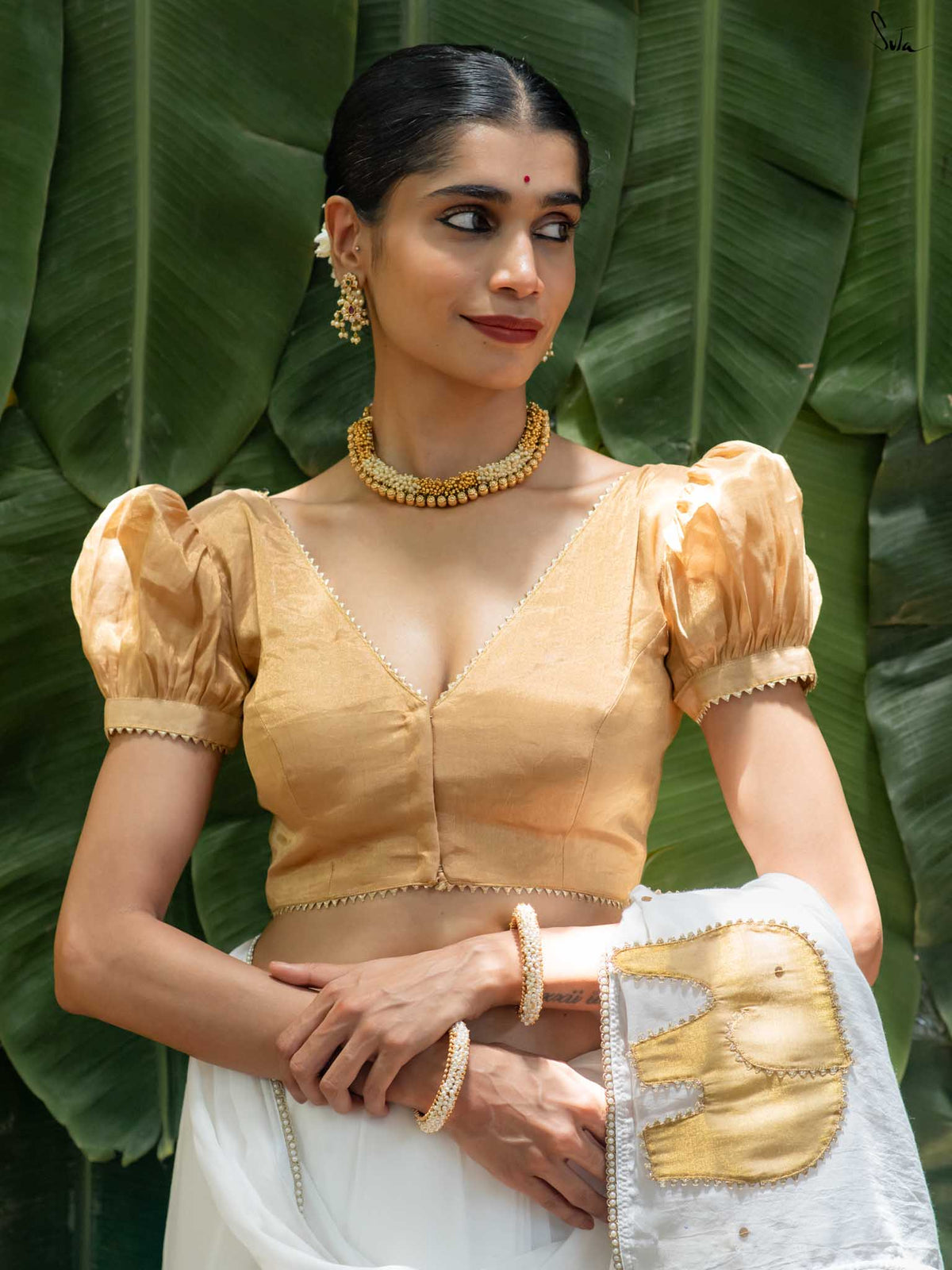 This is a pre-order and your order will be shipped within 3 Days. Description Pontharam means a big, bright star, and this blouse carries that kind of brilliance. Woven in handloom Chanderi silk with zari, it glows with metallicō gold. Feels like stardust on skin. The V-neckline draws the gaze upward and creates a silhouette that feels taller, sleeker, more poised. Lightly puffed sleeves soften the sharpness and add a sculptural curve to the shoulders. Handcrafted for festivities, for women who walk in like constellations. You will radiate in it and eclipse everything else.days