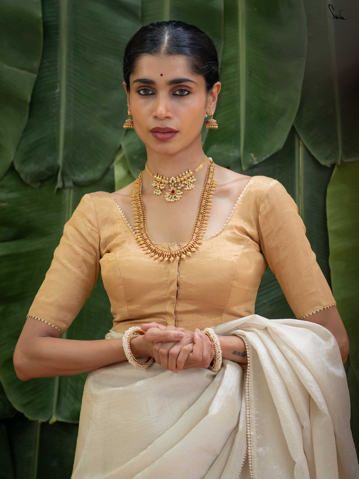 Ponthira is the unveiling of gold. This blouse carries that feeling of something precious being revealed. Crafted in handloom Chanderi silk with zari, it shimmers in a soft gold tone that feels like sunlight slipping through trees. The fabric has a delicate woven texture. The neckline is classic and clean. The edges are trimmed with delicate gold samosa lace to make you look polished and poised.