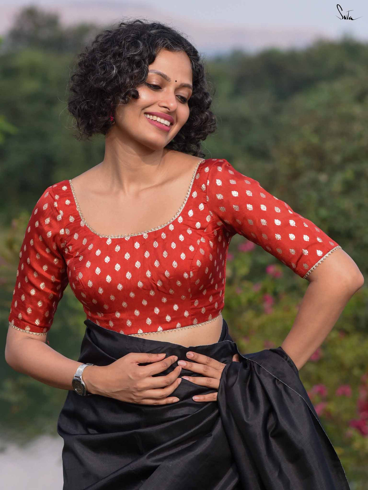 Prajna Sikha is a red brocade blouse with lace accents, crafted for effortless style. Its round neckline, elbow sleeves, and back hook closure make it both classic and contemporary.