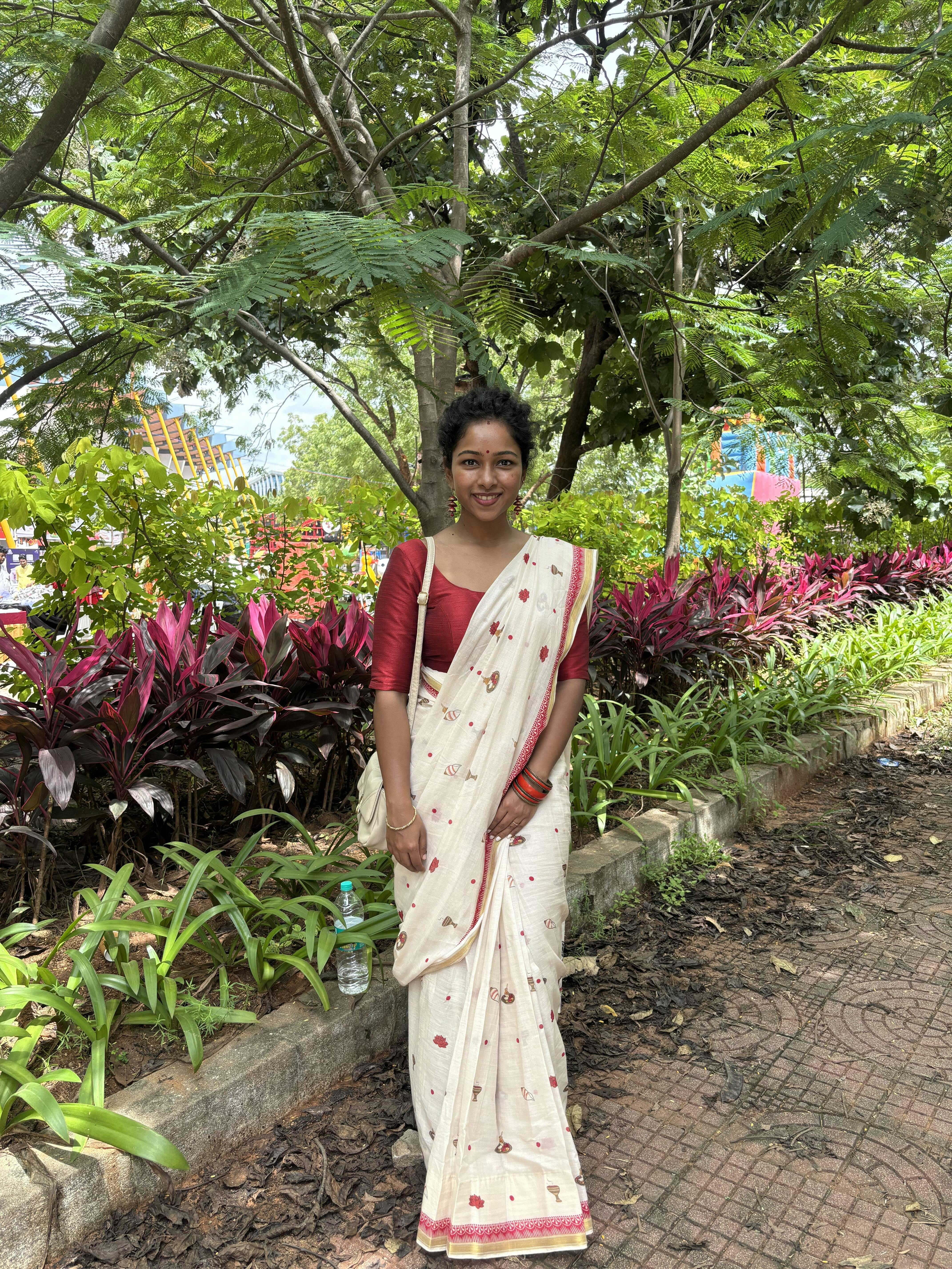 If Pujo is your runway, this is the saree that makes you stand out without even trying. This is an off-white cotton viscose saree with digital prints, framed by a red printed and gold zari border. The body carries delicate pujo motifs, while the pallu unfolds into a vivid scene of people immersed in the festival’s joy. Immerse yourself in it.