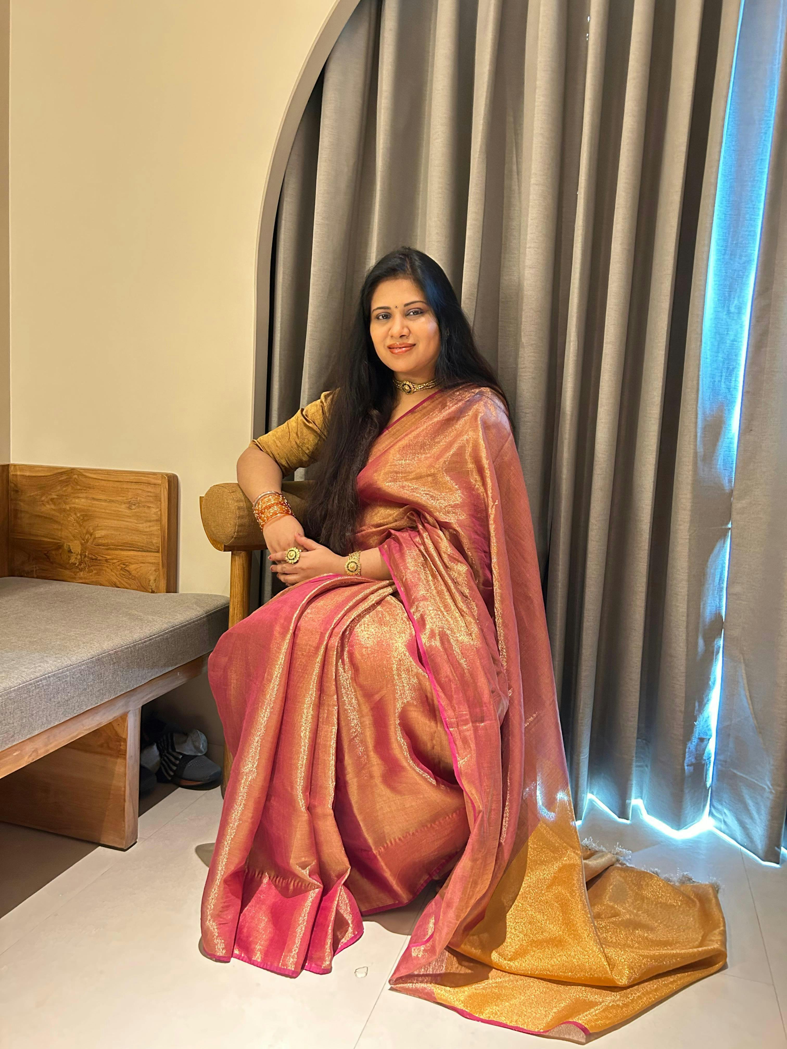 This saree is a blend of linen with zari that gives the fabric an ethereal look and feel! Zari has always been used to infuse that special glow, making fabrics look festive and full of shine. As the zari celebrates you by building a halo of light around you, revel in the beauty and join in the celebration!