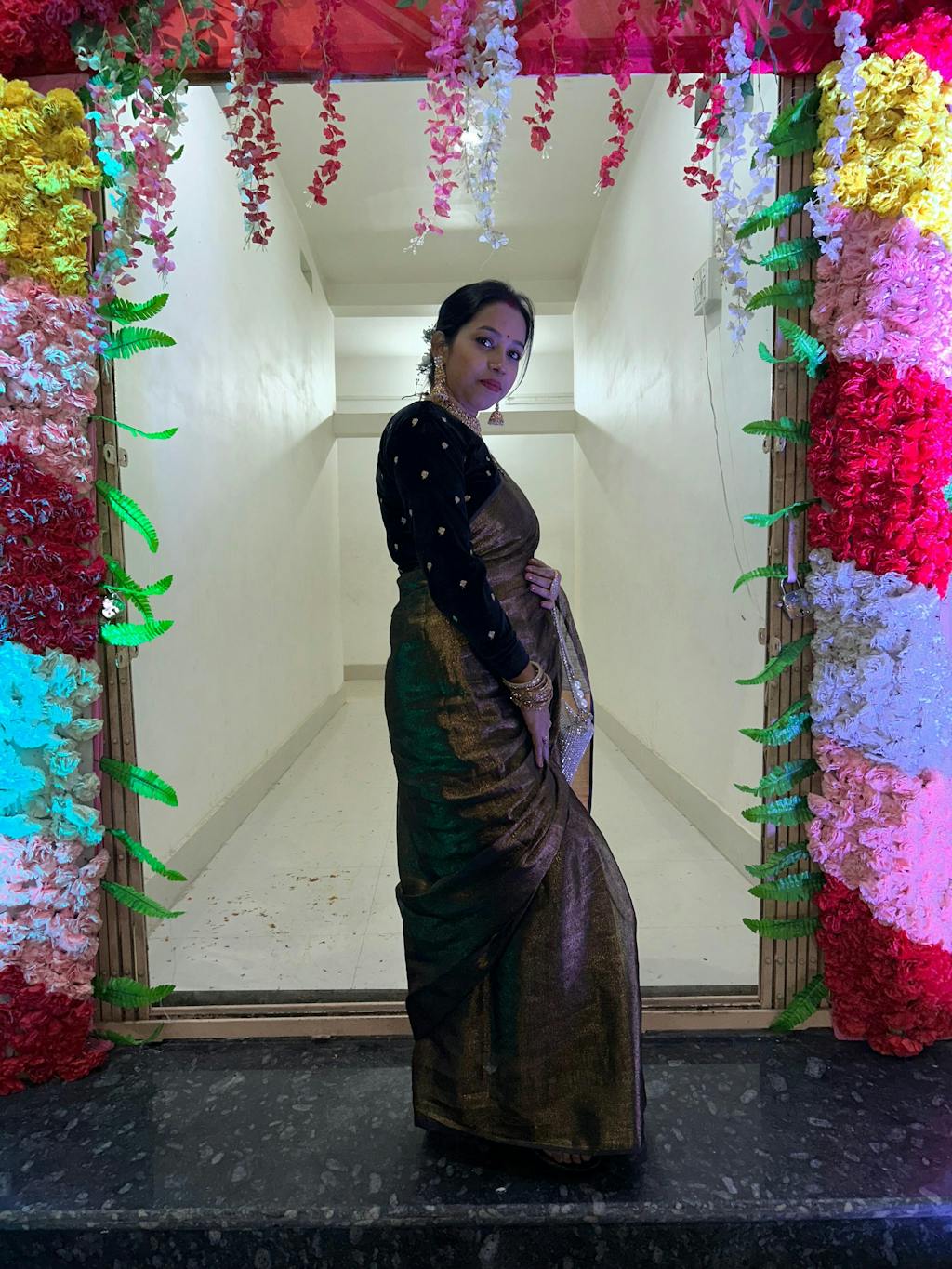 She was loud and unruly. She yearned for power, and never spoke in a whisper. She would charm her way through any misunderstandings with her smile. She protected fiercely, cared passionately, and laughed unreservedly. Confidence is what she wore and its the ability to feel beautiful without needing someone to tell you. They say feeling beautiful has nothing to do with what you look like. But isnt it some what, though?!Raag Kafi has a direct lineage with folk music of India. Embrace your roots, be free, bold and connect to family, tribes, and traditions with this luxurious black and gold saree. The linen drape she wears is about strength and durability. Of attitude too!