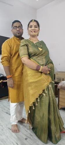 Nothing makes a woman more beautiful than the belief that she is. On your part, its one thing to tell her that shes stunning, and another “ to make her feel it.Its like shes got the subtle greens of nature draped over herself. With a dash of tassel-edged pale gold pallu of this bewitching green saree. Shed gone for a stroll and has come back wrapped around with the hues of green and ochre yellow “ the colours of summer.