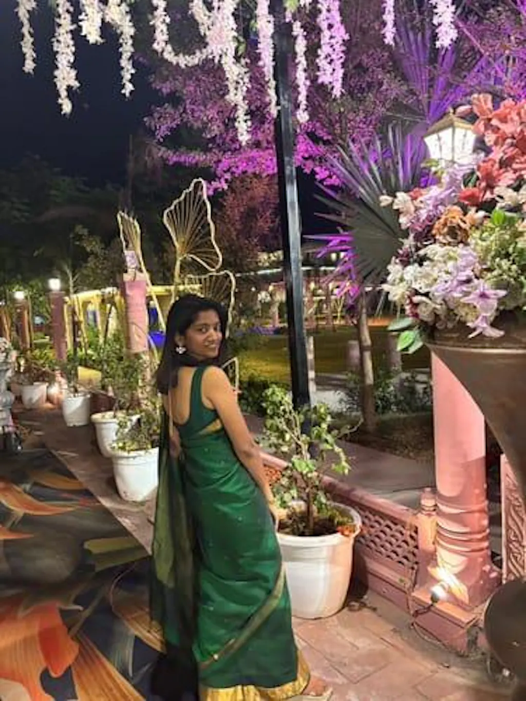 Ta, the model is wearing a size M blouse and the saree is Teej