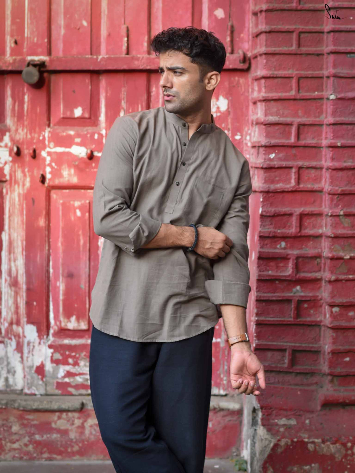 Capture the spirit of the monsoon with Rainy Clouds. Made from soft handloom cotton, this grey full-sleeve shirt is designed with a mandarin collar and a sleek front pocket. Add a touch of nature to your wardrobe with Rainy Clouds.