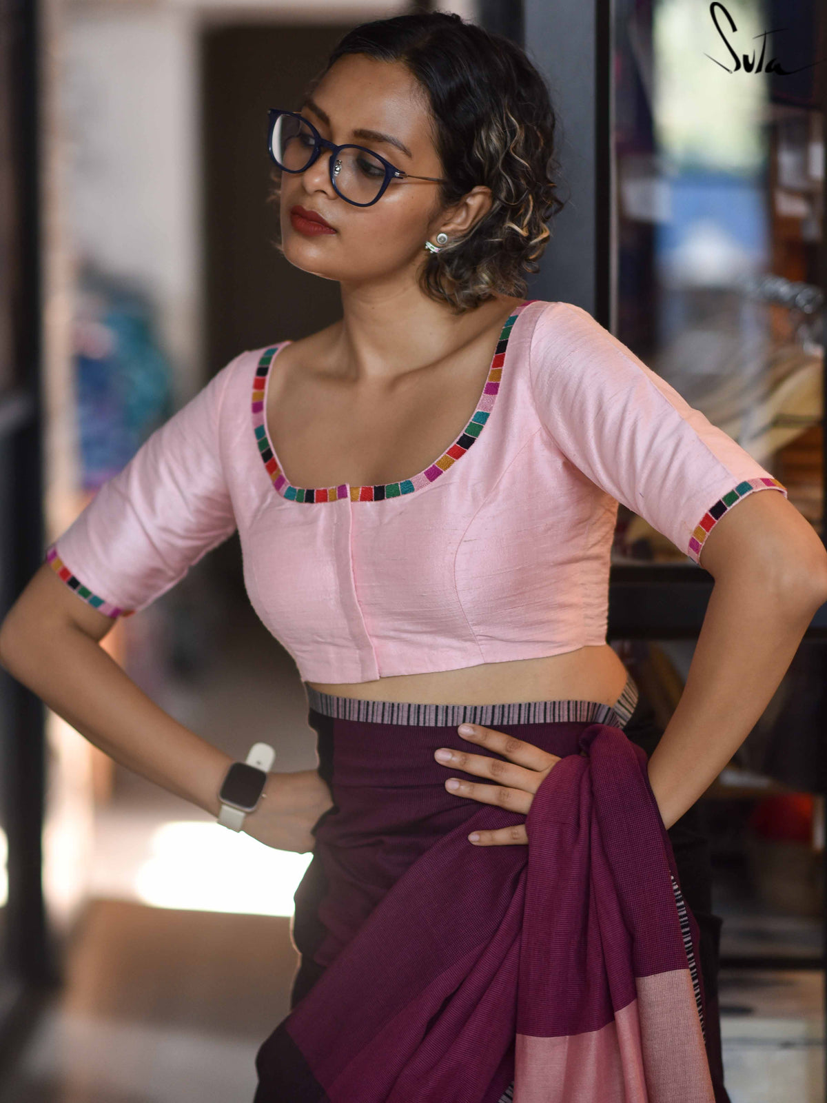 Baby Pink Silk Front Hook Opening Blouse with Multicolour Detailing Around Neck & Sleeve