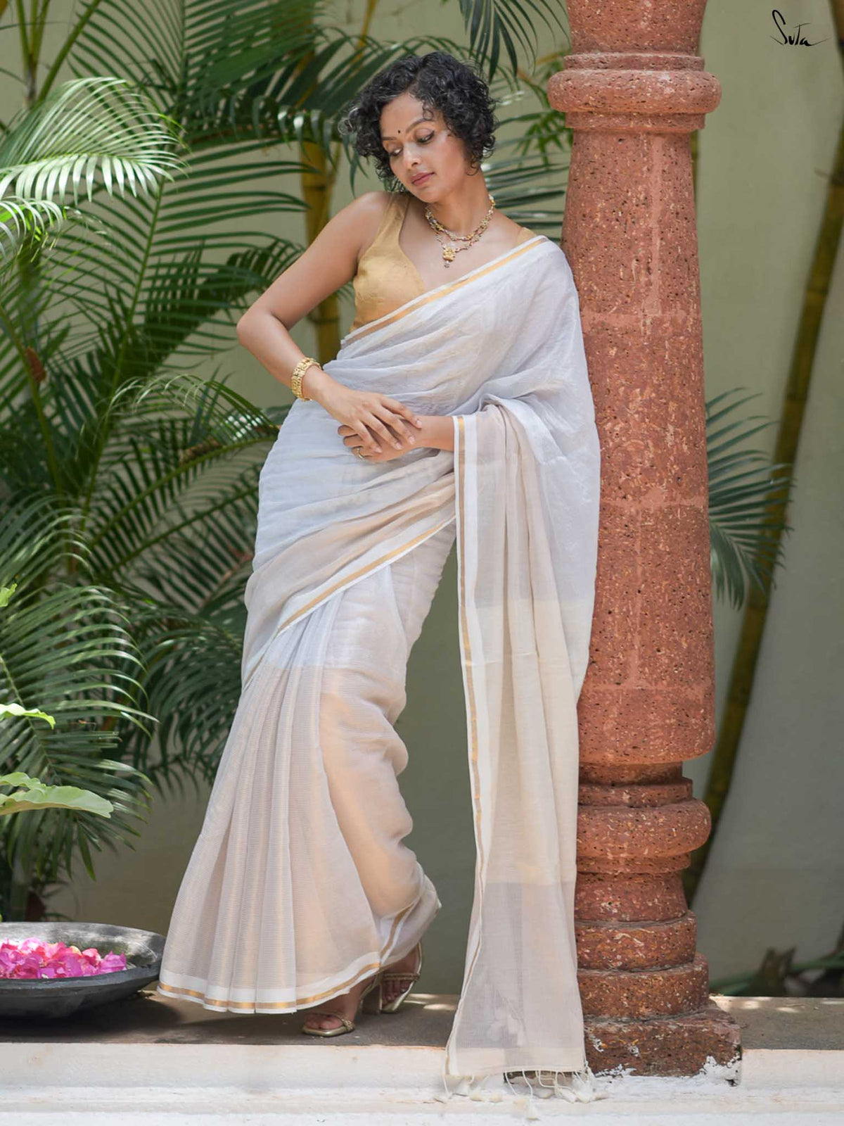 White Cotton Saree with Golden Border