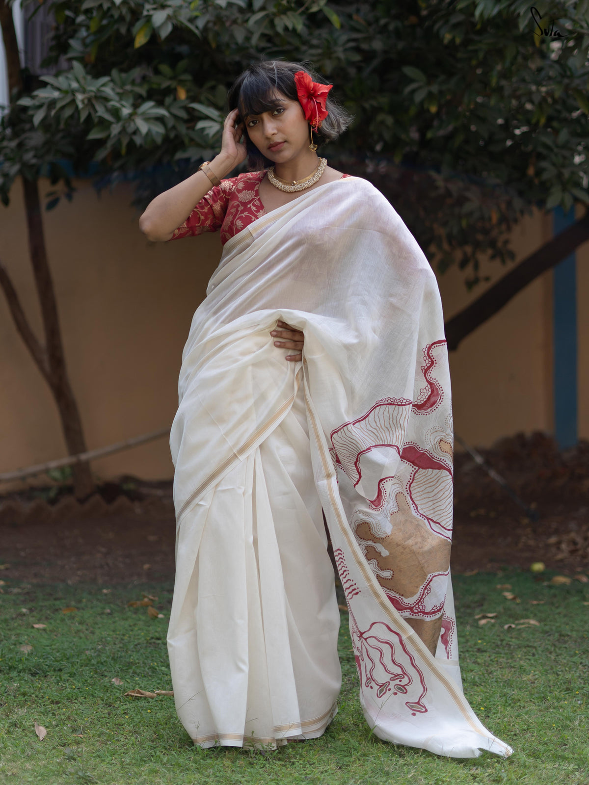 The sarees in this collection hold up the canvas to statement art pieces that represent blossoms from an enchanted forest. And naturally, the flowers ” having been nurtured under a spell ” can charm admirers in a wink. Conceived and brought to life by artist Somya Sharma, they look like cross-sections of botanical paintings viewed under the microscope ” they're that detailed! These hand-painted artisanal gems will be a beaming addition to your wardrobe for their decorations and light-as-air Chanderi silk fabric.