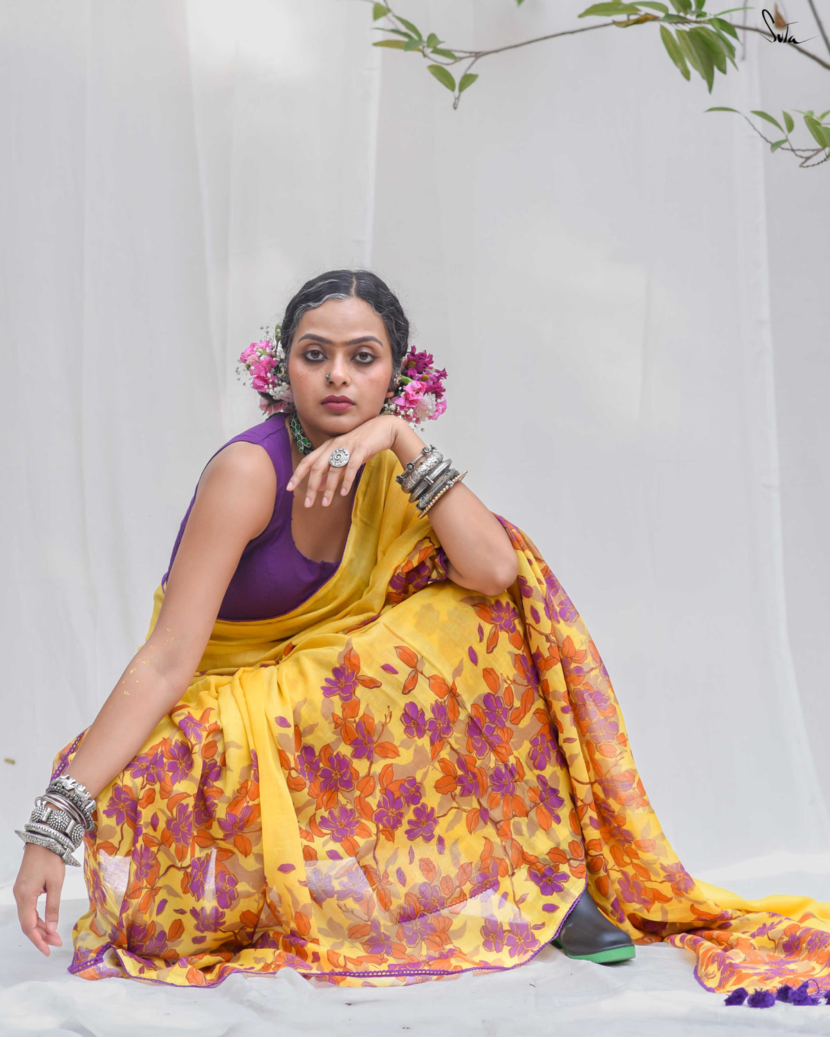 Yellow Mul-Modal Saree with Purple Semal Inspired Digital Prints Contrasting Purple Crochet Lace and Matching Tassels