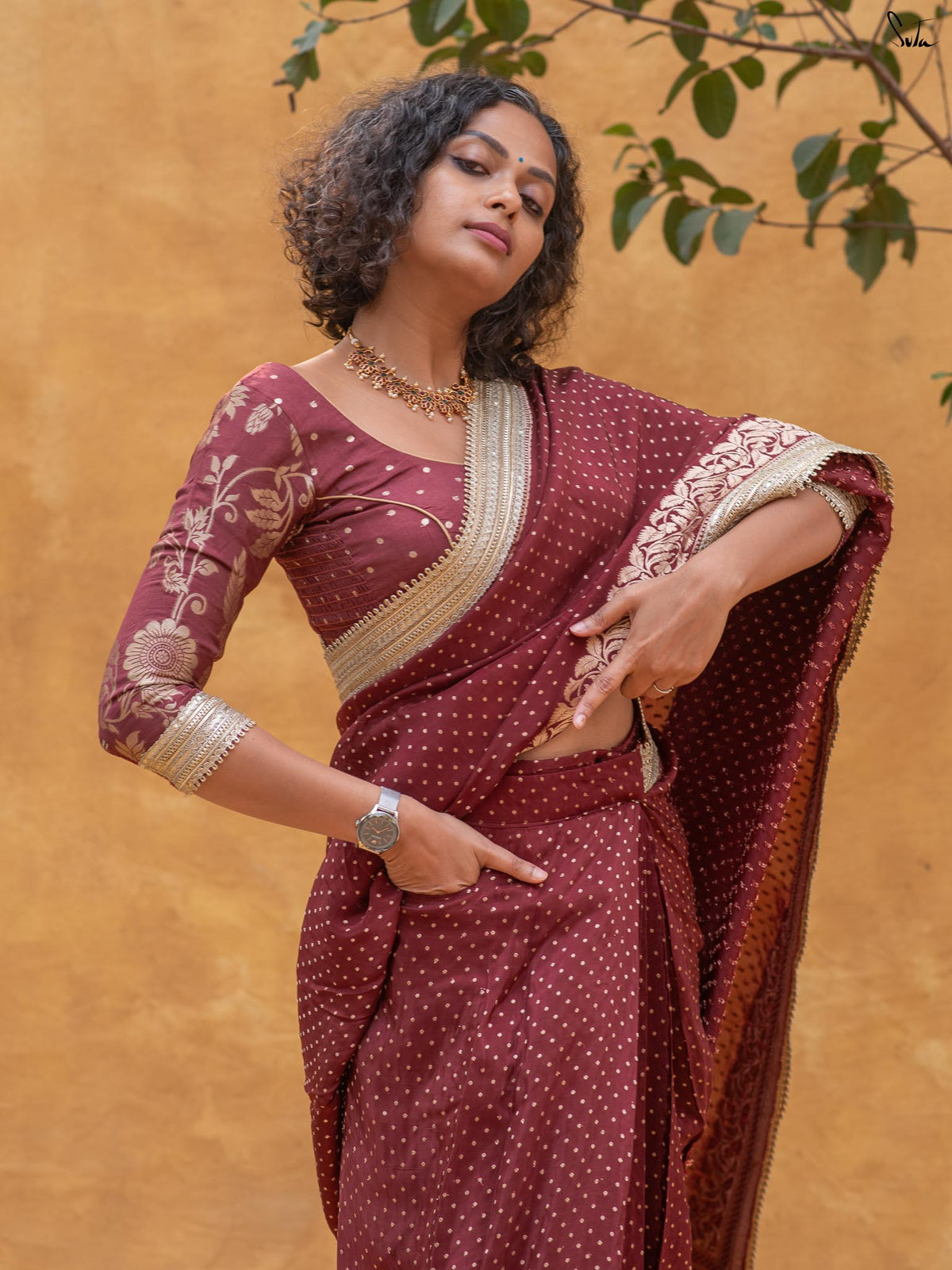 Ready-To-Wear Maroon Viscose Polka Saree with Embroidered Lace