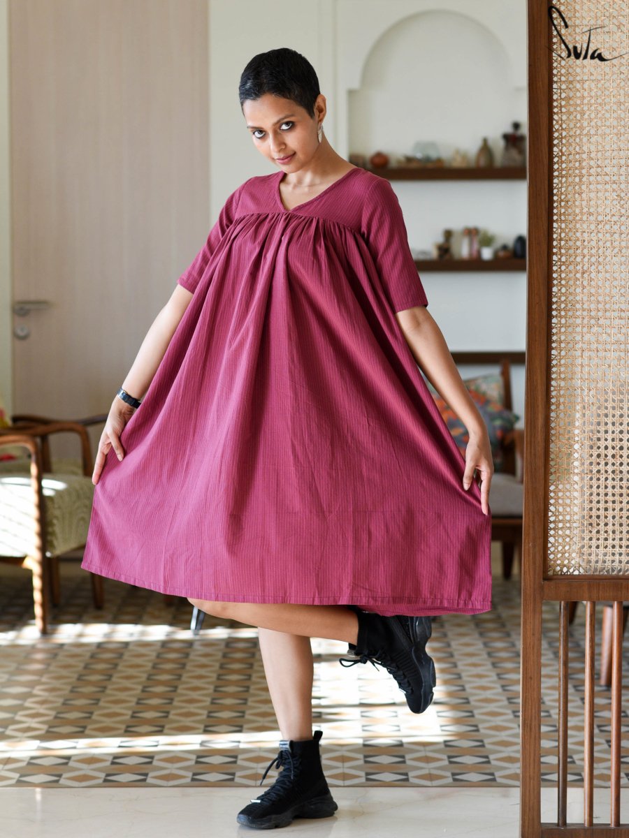 Mauve Cotton Flowy One Piece Dress with V Neckline