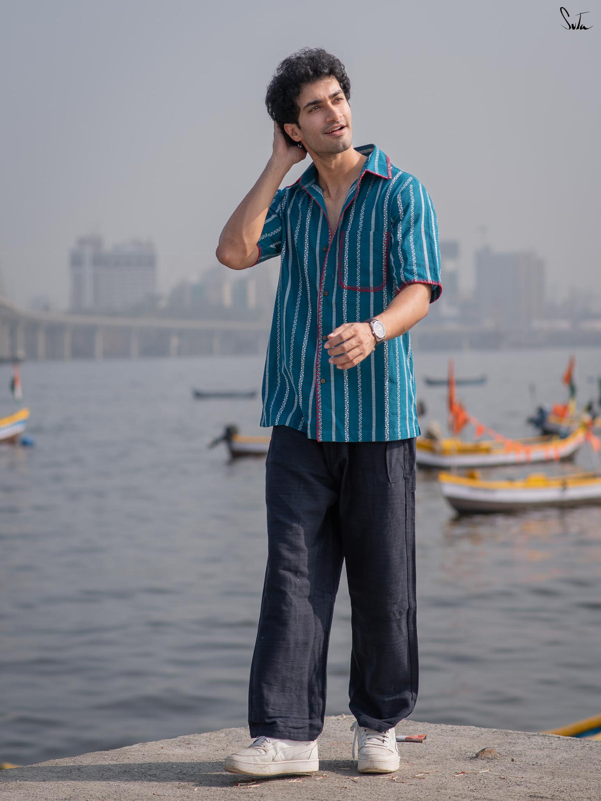 Stripe Tease keeps things classic with breezy blue cotton stripes, but adds just enough mischief to keep it interesting. A hint of hand embroidery on the collar, a playful detail on the pocket, and a proud little peacock embroidered at the back, because why should the front have all the fun?