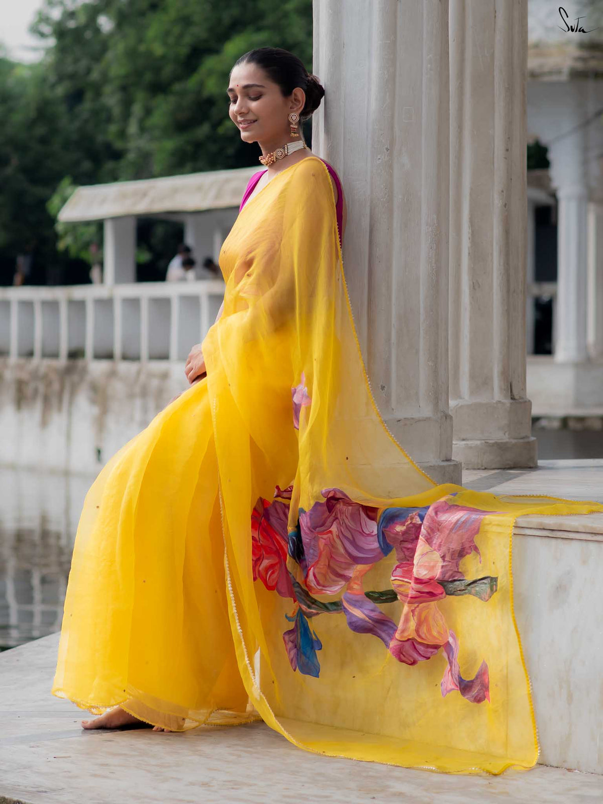 Yellow Organza Sare with Hand-Painted Abstract Iris Motif