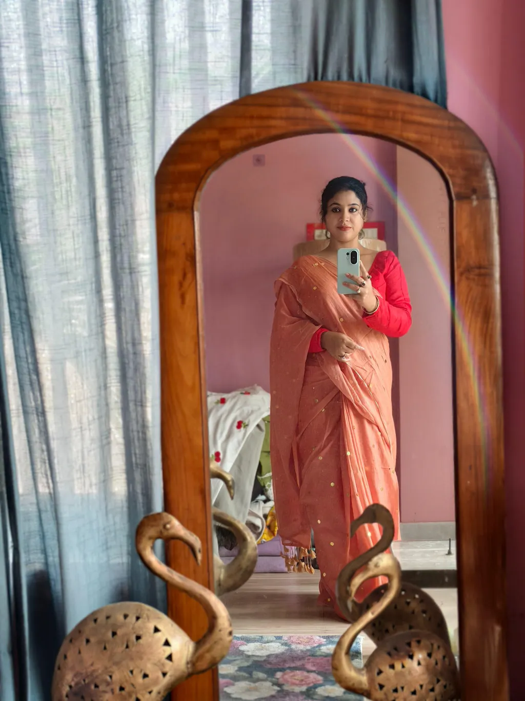 This made-in-heaven mul saree in orange with glitters shines like the sunset sky