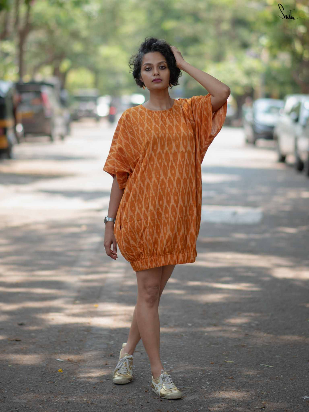 Mustard Cotton One Piece Short Dress with U Neckline and Ikat Design