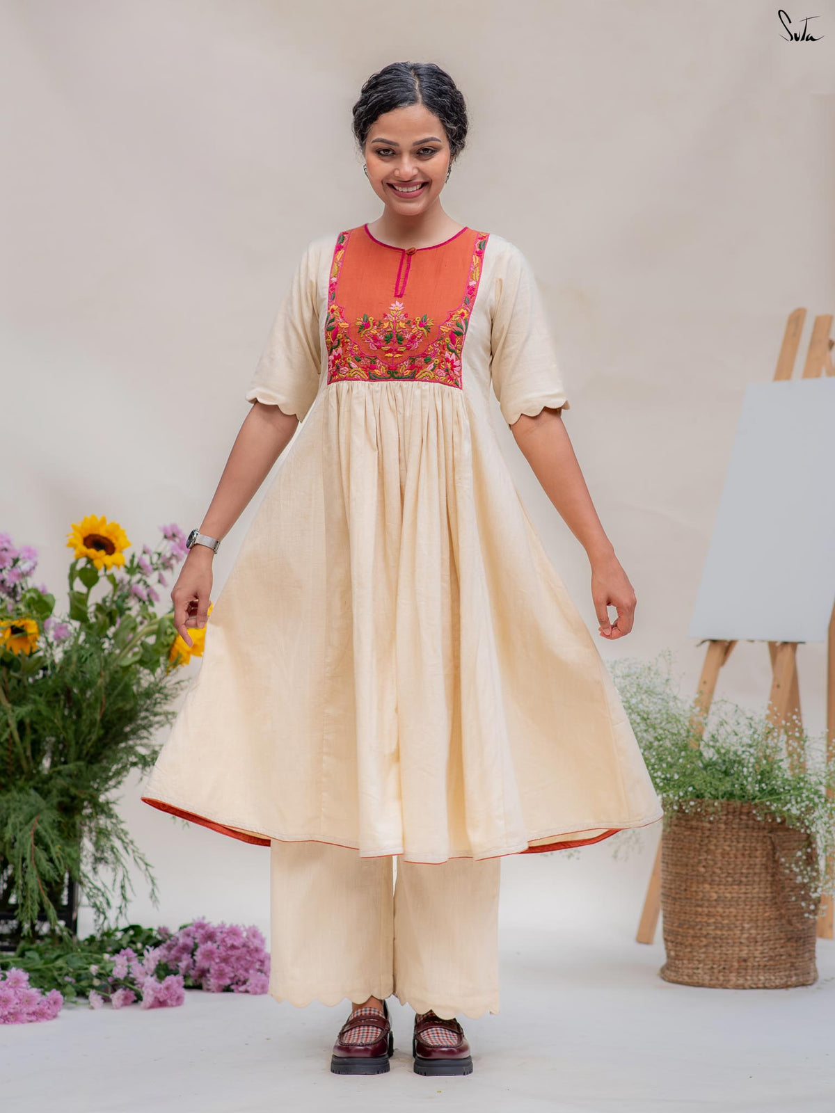 Off white cotton kurta set with hand embroidered floral yoke scalloped details breathable fabric and everyday comfort