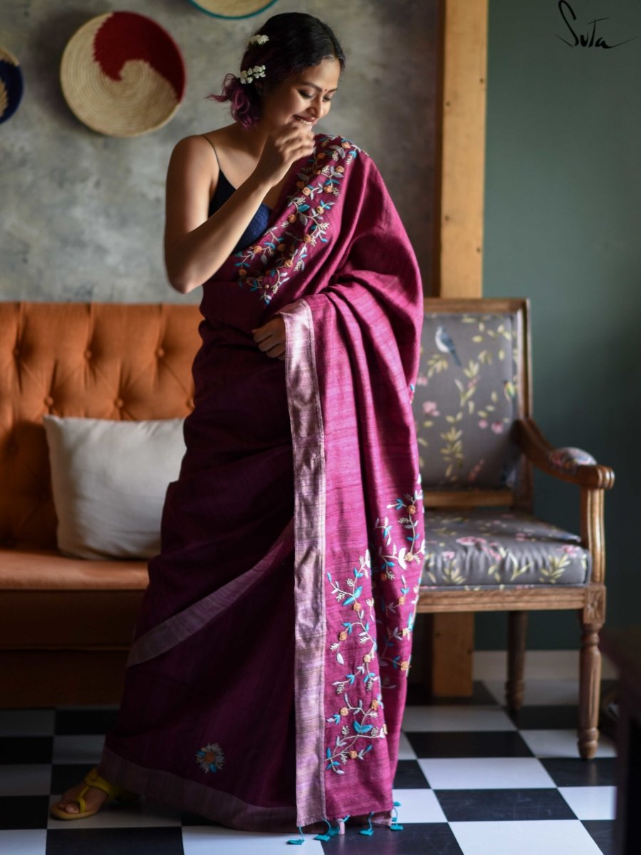 This is a wine-coloured Tussar Ghicha silk saree handwoven with love and adorned with exquisite hand-embroidered detailing!