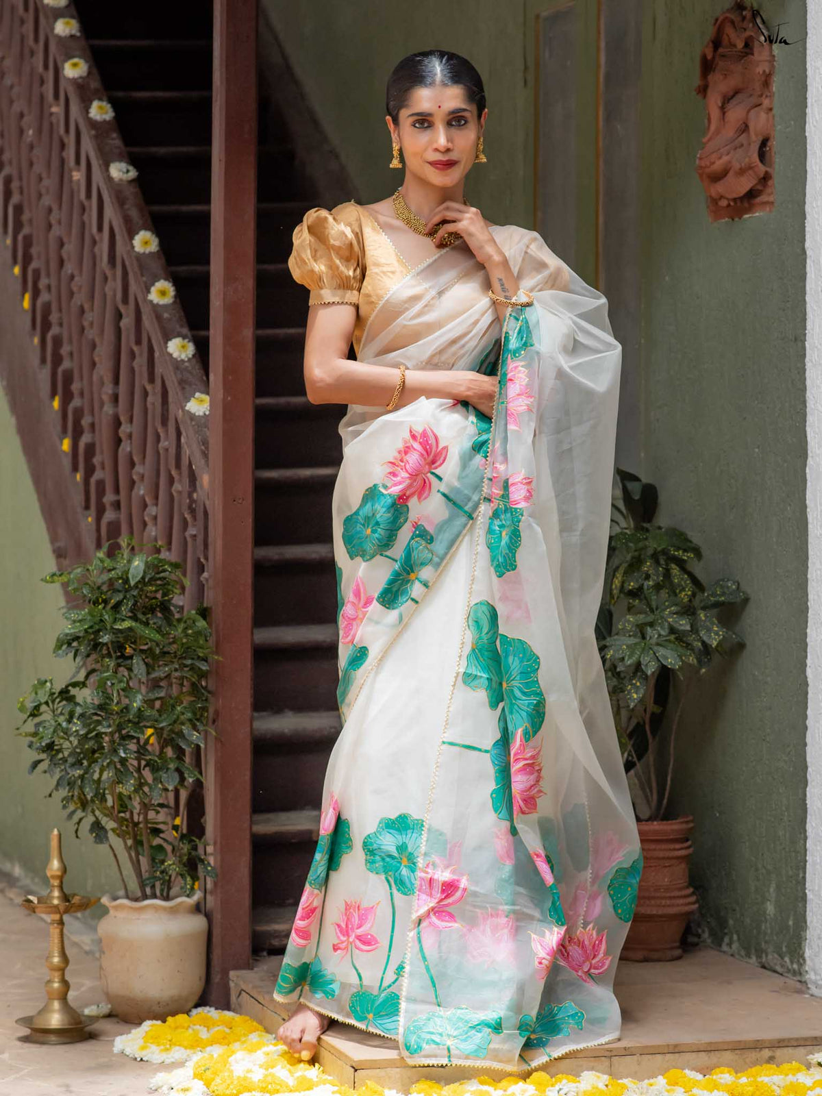 White Organza Saree with Hand-Painted Lotus Motifs and Soft Gold Border
