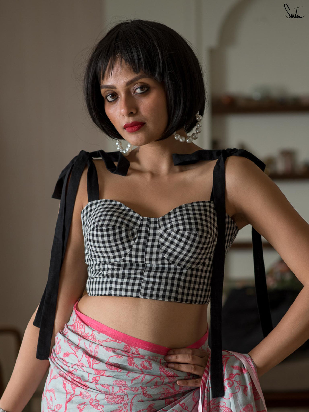 The model is wearing size S blouse and saree from our inhouse collection.