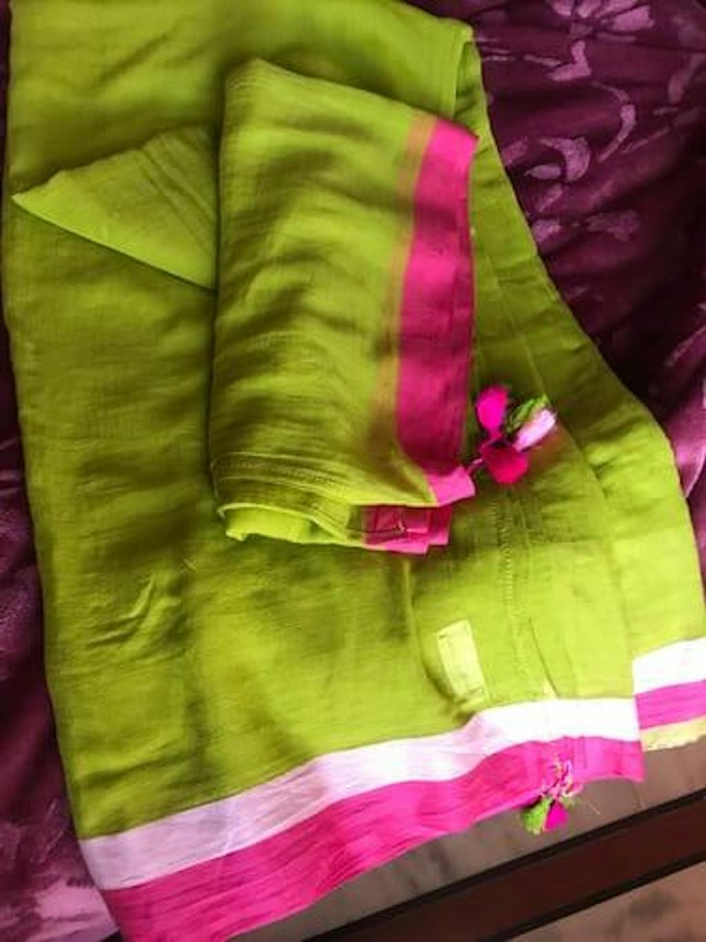 Drape this beautiful green mul-mul saree with a thin light and dark pink border. The contrast colours will perfectly adorn your vibrant personality.