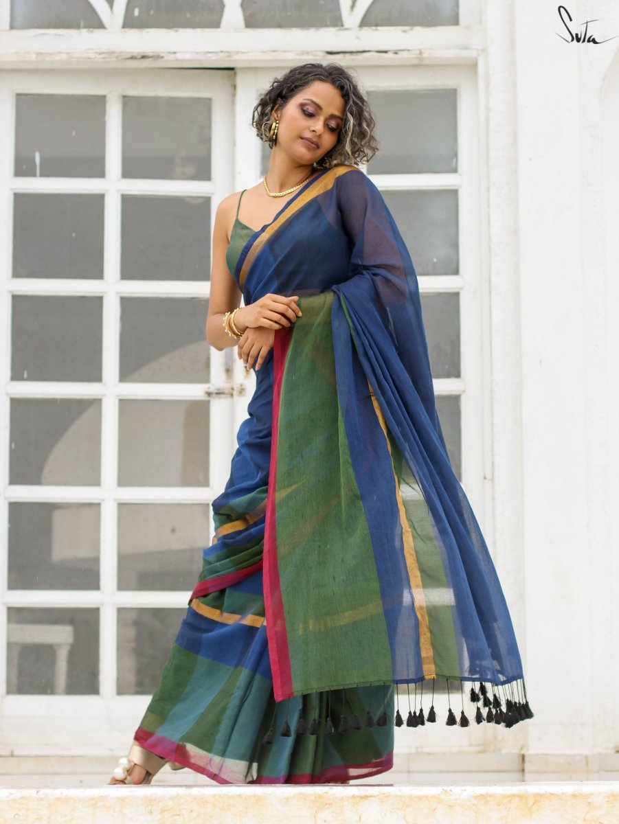 May this lovely saree blue, green, gold and pink saree made of cotton-zari remind you of your most thrilling adventures.
