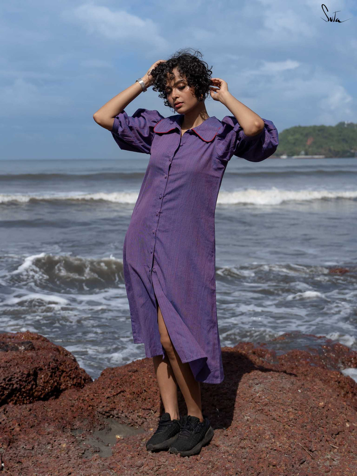 Take a walk down memory lane in this stunning purple handloom cotton dress with beautiful hand-embroidered details.