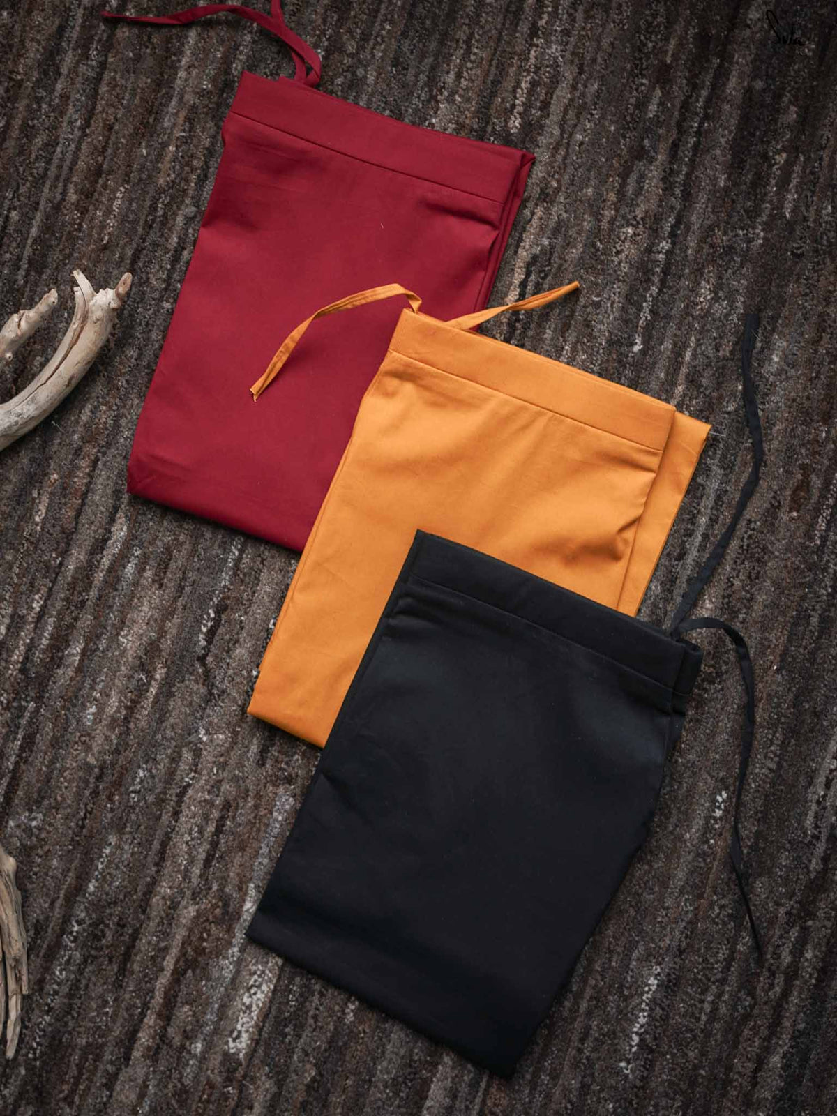 A bold and earthy set of 3 cotton-lycra underskirts in Maroon, Onyx, and Marigold. The rich browns, deep blacks, and sunny yellows create a warm, confident look. Great for anyone wanting to make a statement with warm tones.