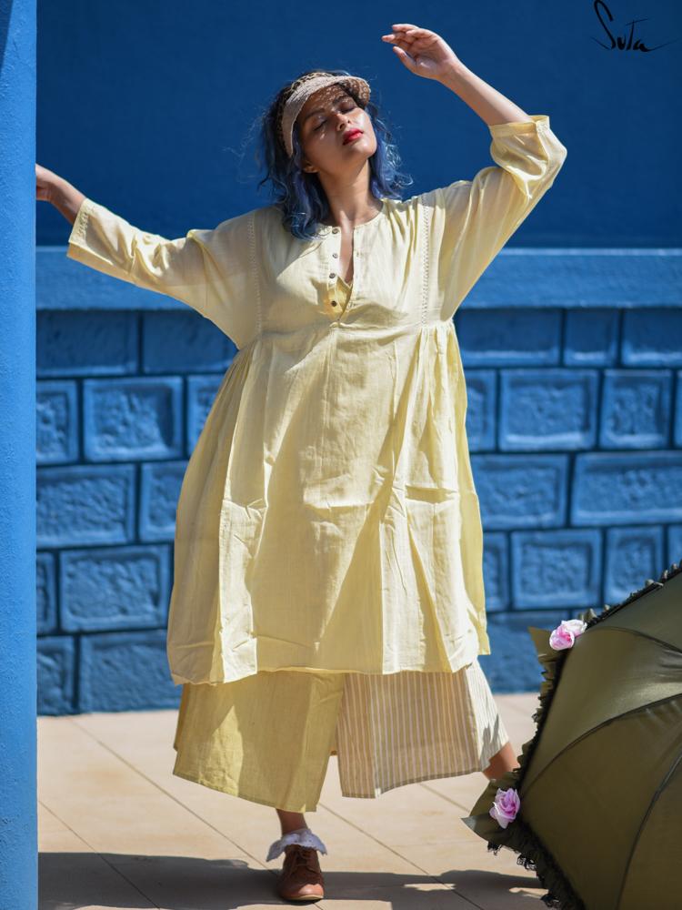 This is a light yellow coloured, handloom cotton, kimono sleeved overlay kurta dress with beautiful Herringbone hand embroidery accents.