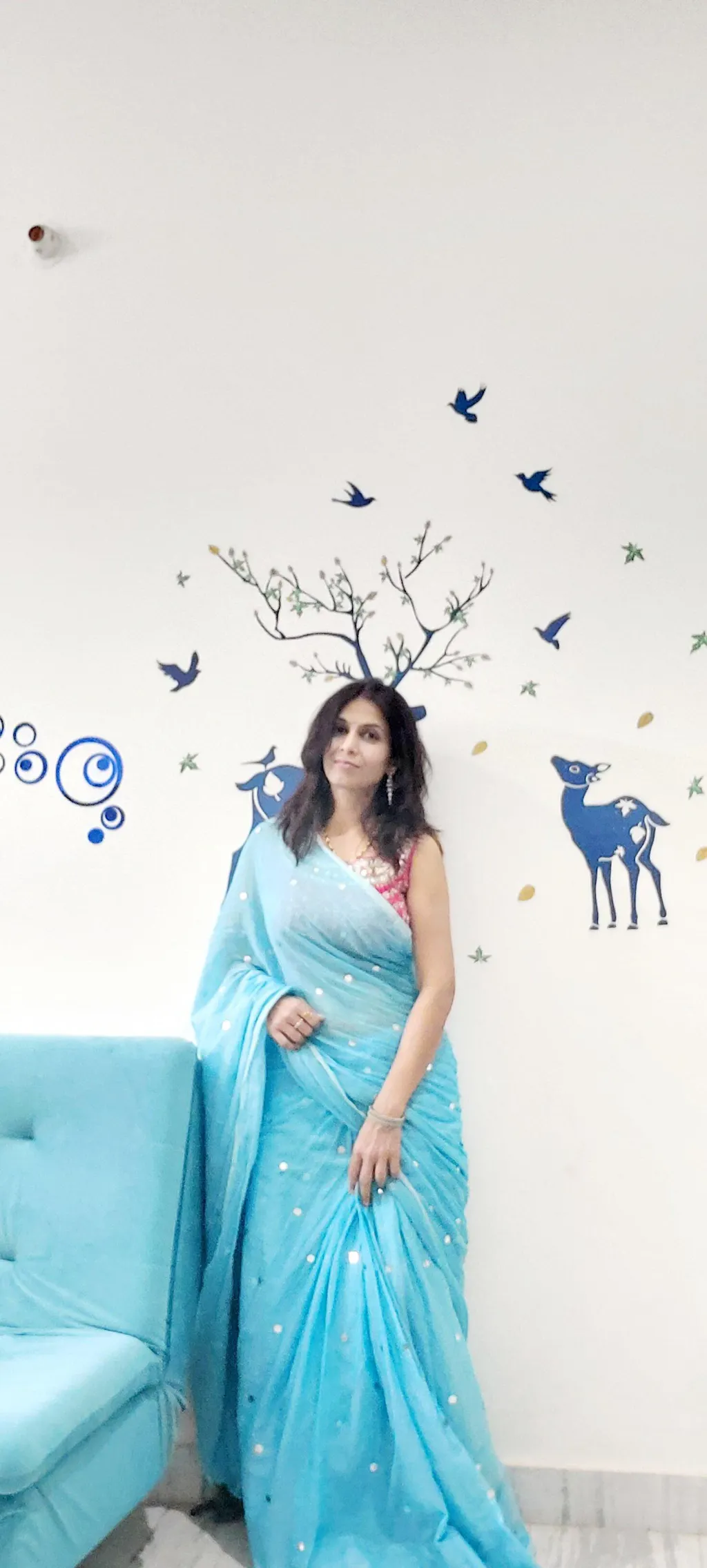 This made-in-heaven mul saree in blue with glitters is a must-have!