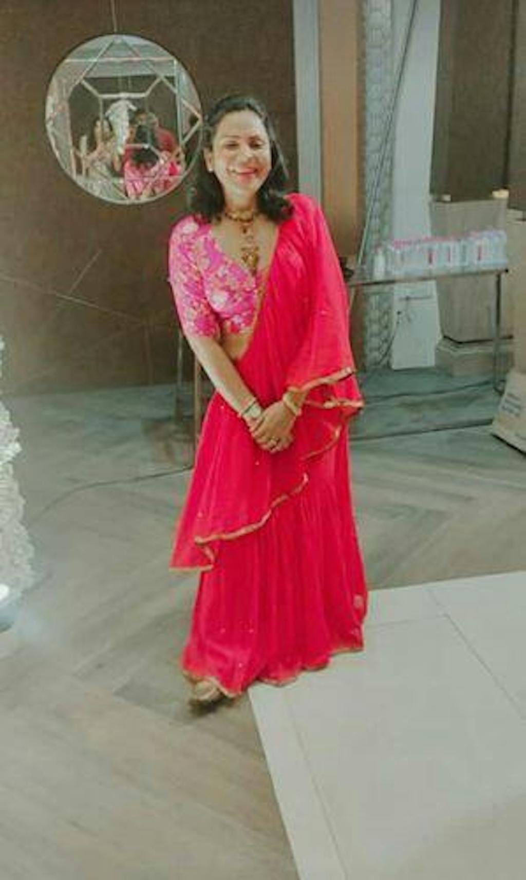 Red Mulmul Cotton Pre Draped Saree with Sequins